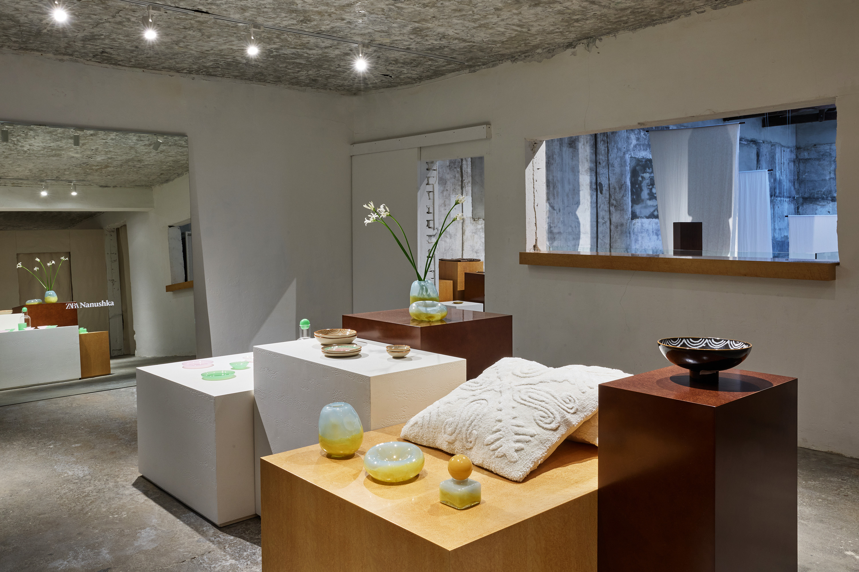 2층에 마련된 쇼룸과 라운지에서는 나누시카가 새롭게 선보이는 홈 컬렉션 제품들이 전시되어 있었어요. 빈티지 풍의 도자기, 우드와 대리석이 어우러진 사이드 테이블, 그리고 다양한 촉감과 색감이 조화를 이루는 러그와 쿠션은 공간을 따뜻하게 만들어 주더군요. 토템에서 영감을 받은 캔들 트레이와 재활용 알루미늄으로 제작된 촛대도 있었는데, 자라와 나누시카의 공예적 감각이 그대로 드러났습니다.