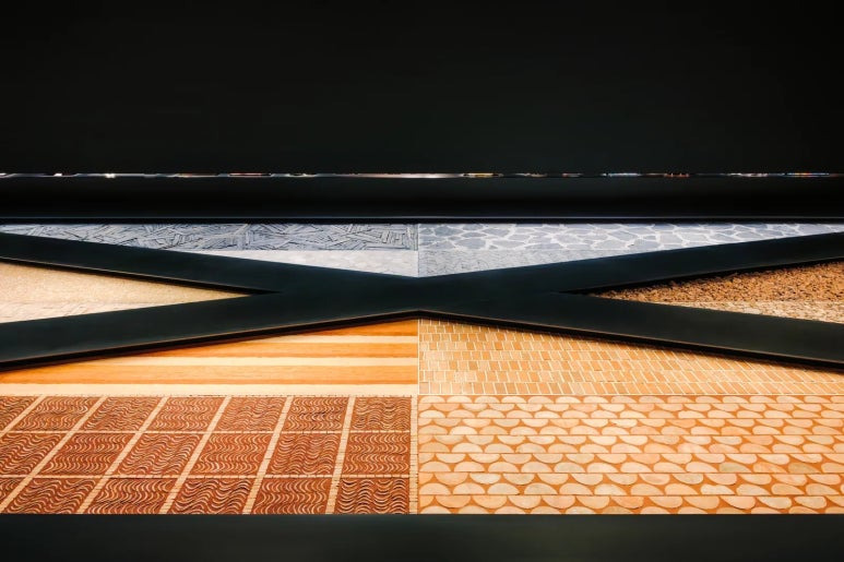 이번 컬렉션의 중심 테마는 '대지'였습니다. 에르메스는 바닥을 하나의 무대로 설정하고, 벽돌, 석재, 압착된 흙 등 가공하지 않은 원자재를 활용해 공간을 연출했습니다. 이러한 원초적인 재료들은 에르메스 리빙의 최신 디자인들과 교차하여 배치되었으며, 이는 하우스의 클래식 제품들과 함께 전시되어 전통과 현대적 감각이 어떻게 공존할 수 있는지를 보여주었습니다.