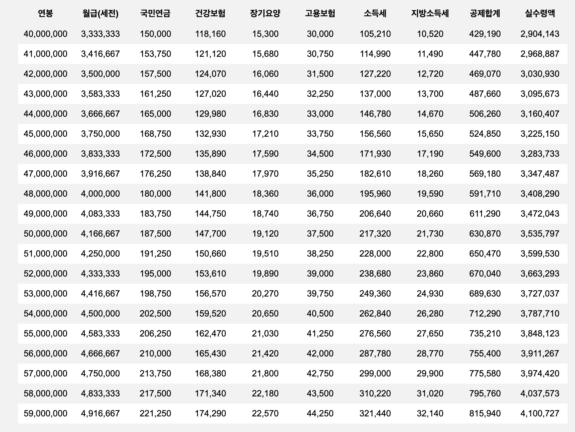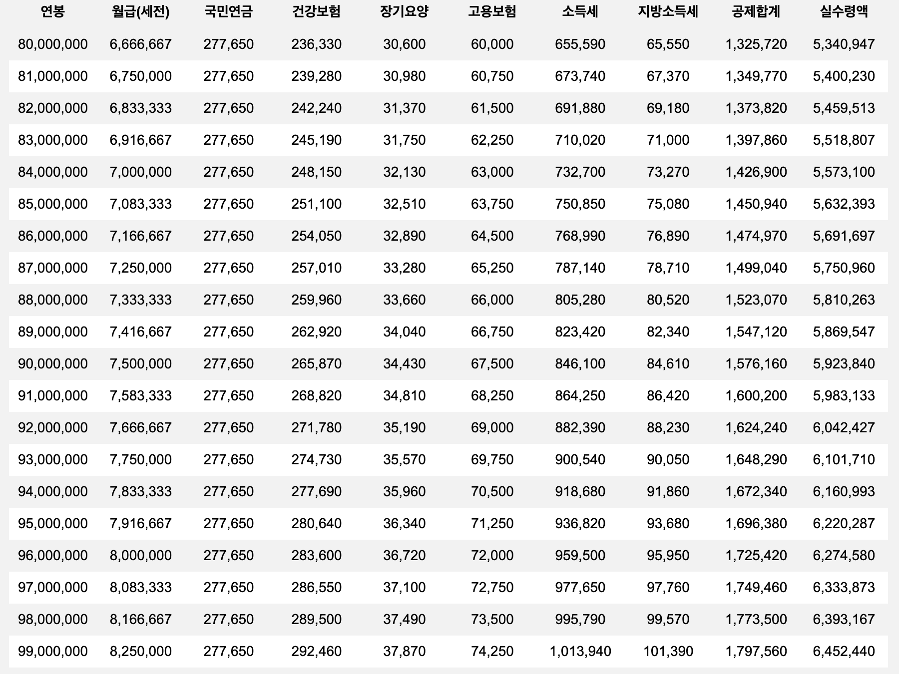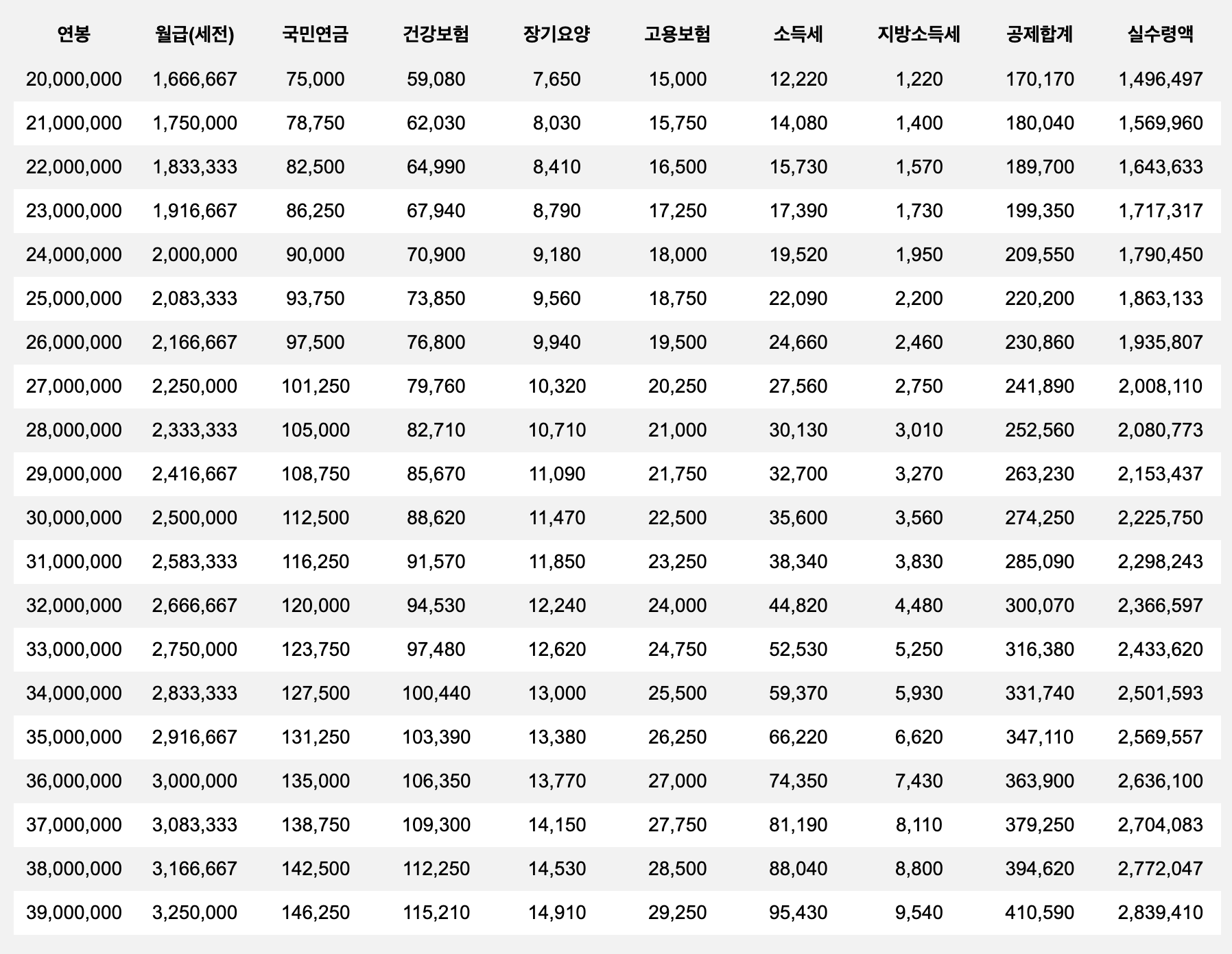 아래 제공하는 2024년 연봉별 실수령액 표는 부양가족 한 명(본인)을 기준으로 작성되었습니다. 소득세와 지방소득세는 부양가족 수에 따라 약간 변동할 수 있으니 참고 바랍니다.