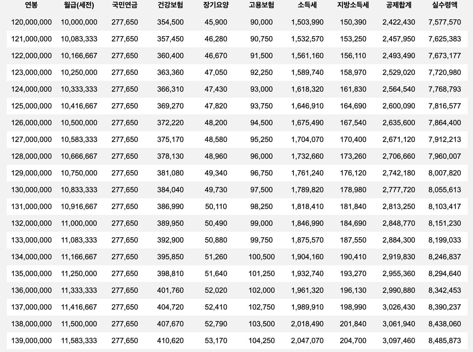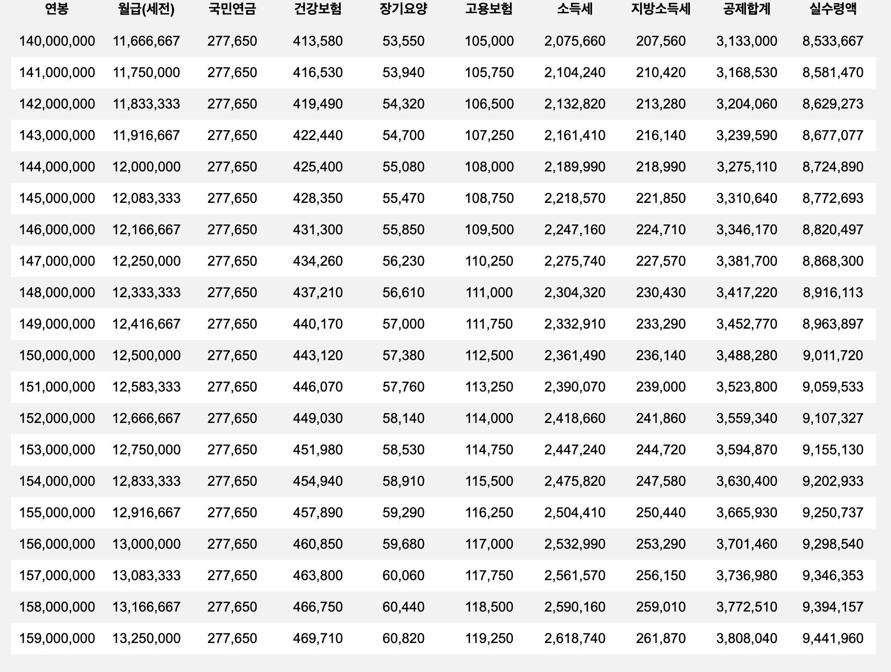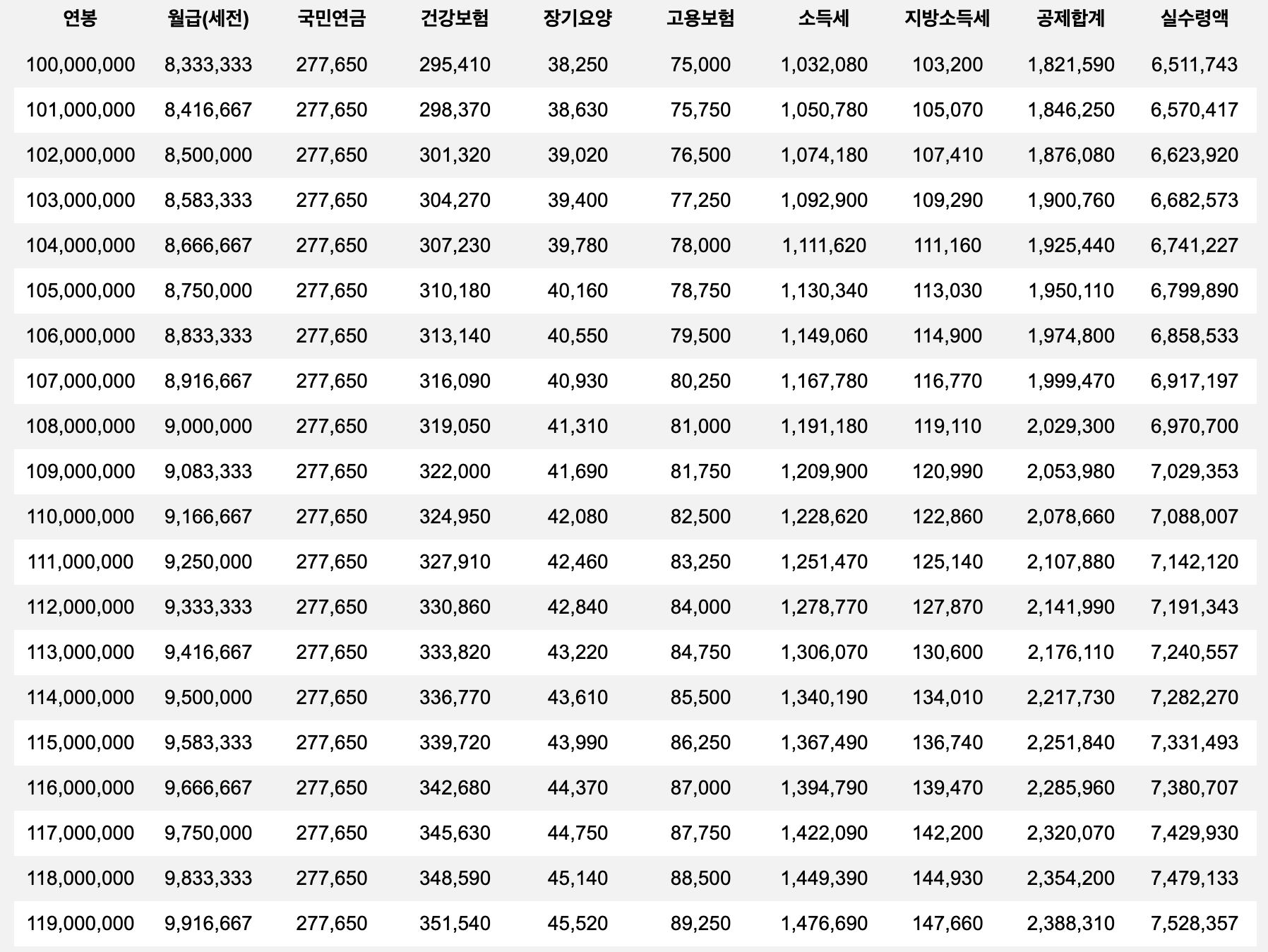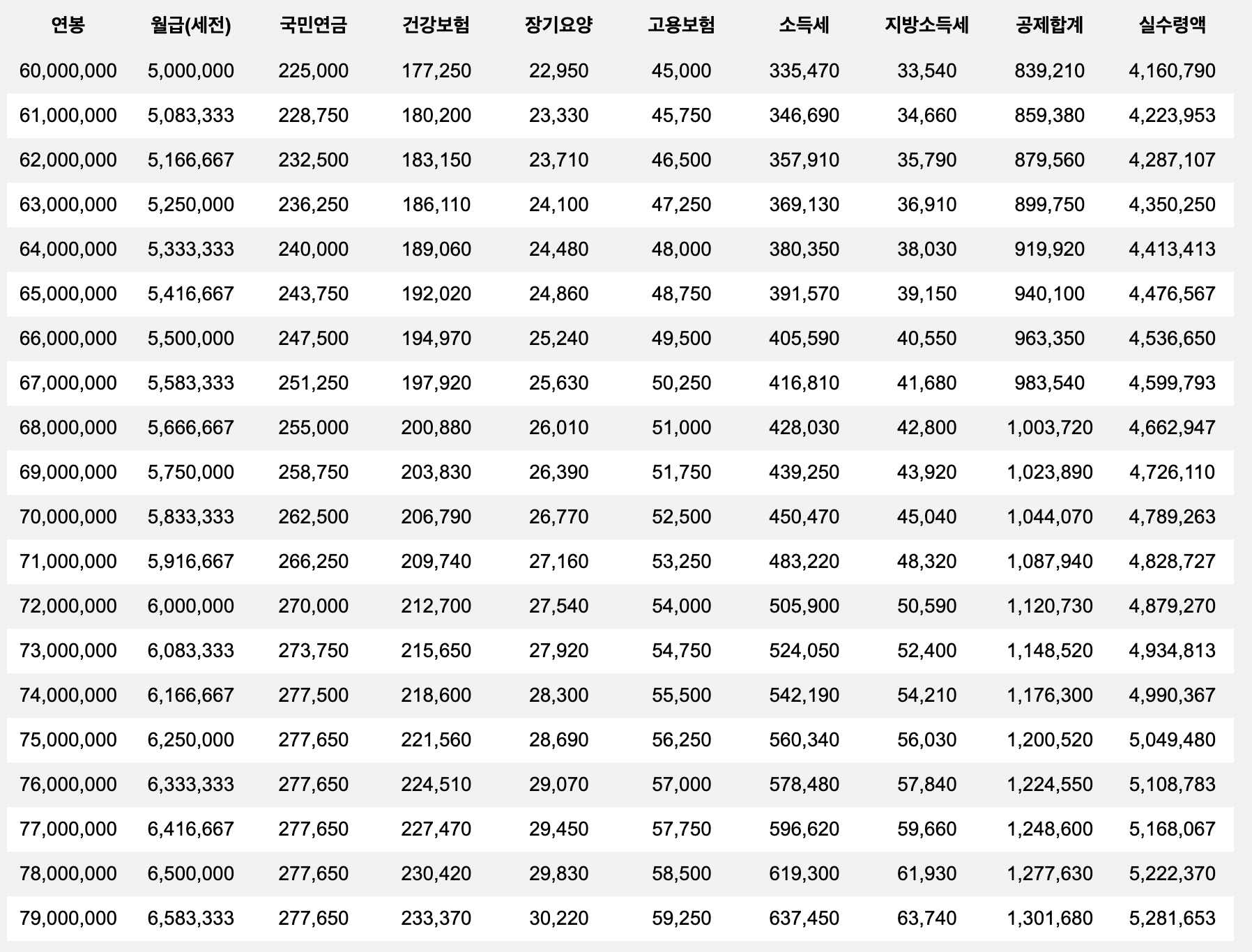 아래 제공하는 2024년 연봉별 실수령액 표는 부양가족 한 명(본인)을 기준으로 작성되었습니다. 소득세와 지방소득세는 부양가족 수에 따라 약간 변동할 수 있으니 참고 바랍니다.