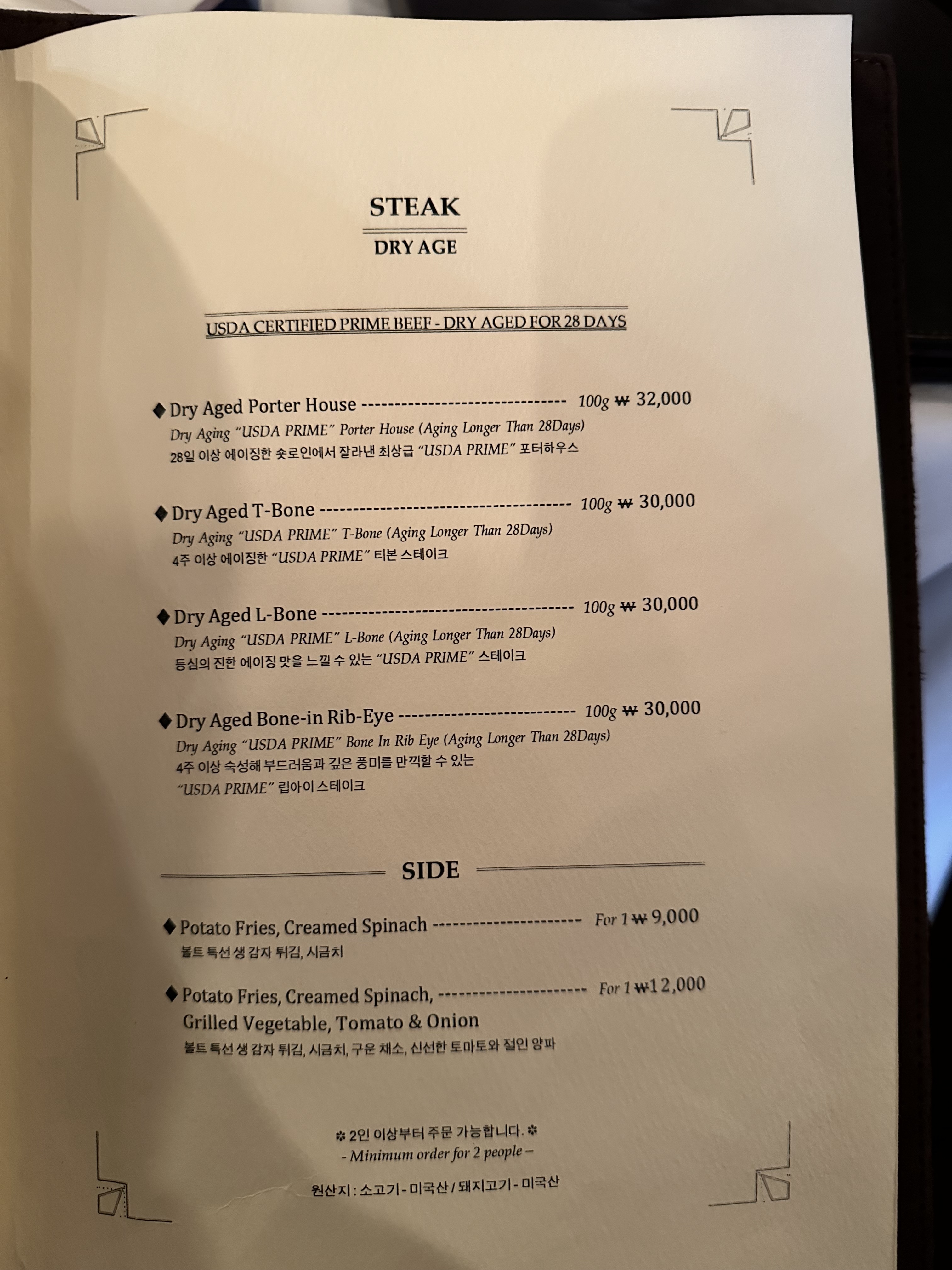 볼트 스테이크 하우스의 핵심은 무엇보다도 고기의 품질에 있다. 볼트는 미국 농무부(USDA)가 인증한 상위 3% 이내의 최상급 프라임육만을 엄선하여 사용한다. 이 고기들은 모두 뉴욕에서 유명한 피터 루거 스테이크 하우스와 동일한 소스를 사용하는데, 이 소스는 120년 이상의 전통을 자랑한다. 피터 루거는 뉴욕에서도 손꼽히는 스테이크 하우스로, 그 명성은 미국 전역에 널리 알려져 있다. 볼트가 이와 동일한 품질의 고기를 제공한다는 점은 스테이크 애호가들에게는 놓칠 수 없는 매력 포인트다.