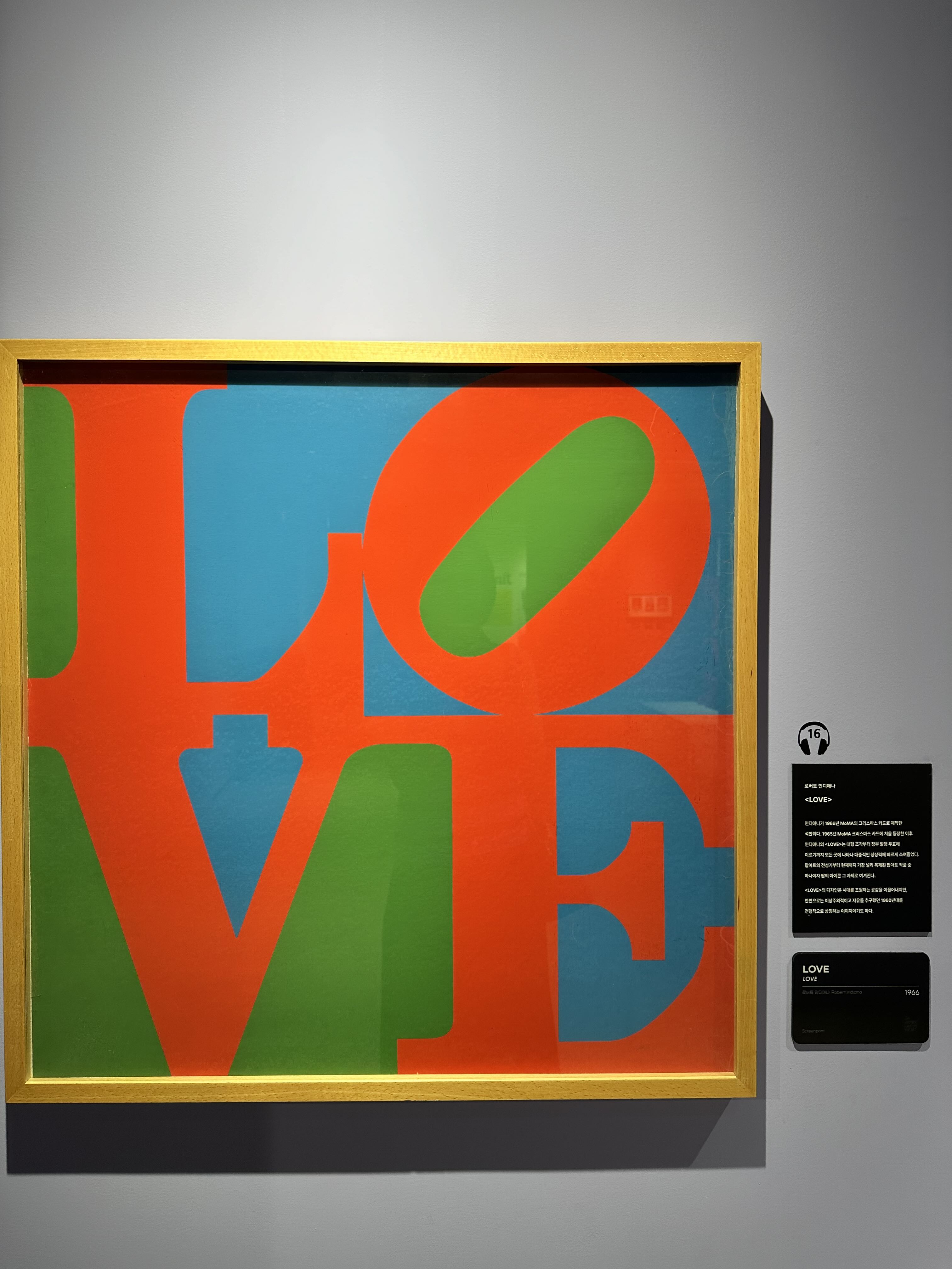 이 작품은 1964년에 처음으로 제작되었으며, 빨강, 파랑, 초록, 그리고 네온 핑크의 조합으로 이루어진 대문자 "LOVE"가 특징입니다. "LOVE"는 두 개의 문자가 위에 있고 두 개의 문자가 아래에 있는 간결한 디자인으로, "O" 문자는 약간 기울어져 있습니다. 이 작품은 이후 다양한 형태로 재해석되었으며, 조각, 포스터, 우표 등 다양한 매체로 확산되었습니다. 1965년 뉴욕 모마 현대미술관의 크리스마스 카드에 LOVE가 사용되면서 수 많은 사람들의 머리 속에 기억하게 되었다.